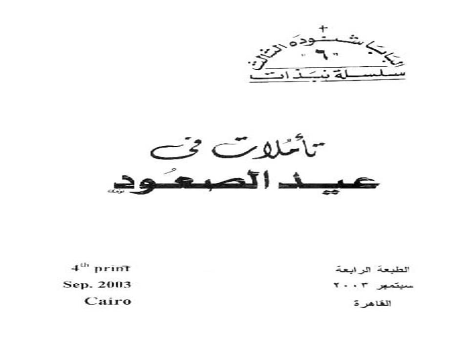يسرني أن أقدم لكم هذه النبذة عن عيد الصعود المجيد ، حيث أحدثكم فيها عن : * صعود السيد المسيح كان بالجسد * كان صعوداً بجسد ممجد ، ليس ضد الجاذبية الأرضية * ما معنى صعوده على السحاب ؟ وعلاقته بالسحاب ؟ * الصعود دليل على لاهوته ، وأنتهاء إخلائه لذاته . * ما معنى جلوسه عن يمين الآب ؟ * السيد المسيح في صعوده لم يفارق كنيسته . * كان صعوده عملية فطام لتلاميذه . * صعوده كان عربوناً لصعودنا إليه * تأملات في الصعود . ودروس من مجد الصعود * الحياة الروحية كلها صعود * حكمة العشرة أيام بين الصعود والعنصرة .