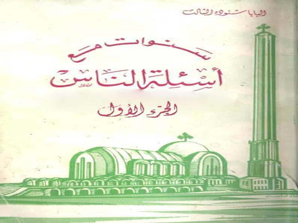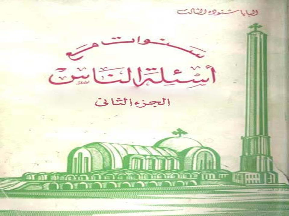 هذه المجموعة التي نصدرها لك أيها القارئ العزيز ، تحت عنوان ( سنوات مع أسئلة الناس ) تشمل ما أمكننا اختياره لك ، من بين آلاف الأسئلة التي عرضت علينا ، منذ إنشاء أسقفية المعاهد الدينية و التربية الكنسية ، في سنة 1962 حتي الآن كان الجزء الأول منها يدور حول أسئلة خاصة بالكتاب المقدس أي حول آيات منه تبدو عسرة الفهم ، أو يفسرها البعض خاطئاً ، وتحتاج إلي شرح وتوضيح . وقد أجبنا فيه علي أربعين سؤالاً تتكرر علي أفواه الكثيرين وكان الجزء الثاني خاصاً بأسئلة لاهوتية وعقائدية من التي تشغل عقول الناس راعينا فيها علي قدر الإمكان أن تكون في أسلوب سهل يمكن أن يفهمه الكل . وقد أجبنا في ذلك الجزء علي 35 سؤالاً تهم الجميع وهذا الجزء الثالث خاص بأسئلة روحية في مجموعها ومعها أسئلة تدور في المجتمع وتحتاج إلي جواب ، كسؤال عن الخمر ، وآخر عن نقل الأعضاء ، وثالث عن كيفية حل المشاكل . وهذه أجبنا عليها بشيء من التفاصيل . وقد شمل هذا الجزء 44 سؤالاً راعينا في غالبيتها التركيز في الإجابة وهناك جزء رابع في المطبعة حالياً أتوقع أن يصدر قريباً إن شاء الله ، ربما بعد أسبوعين من وصول هذا الكتاب إلي يديك . وسأوالي - بفضل صلواتكم - نشر ما يمكننا نشره من إجابات الأسئلة ، التي نري لها صفة العمومية والأهمية كونوا بخير ، وليكن الرب معكم .