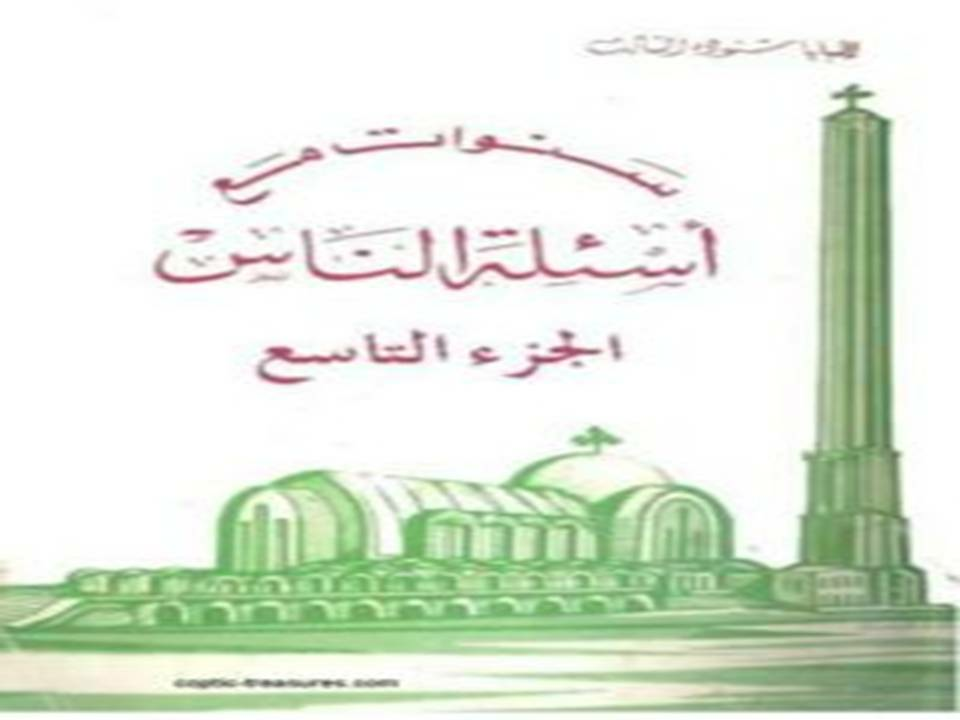 نوالي معك أيها القارئ العزيز نشر الإجابات عن مجموعة من الأسئلة التي وردت إلينا في إجتماعنا العام بالكاتدرائية ، أو أثناء محاضراتنا في الكلية الإكليريكية القاهرة أو الإسكندرية أو في معهد الرعاية في الأجزاء الثمانية الماضية نشرنا لك الإجابة عن 384 سؤالاً في شتي المجالات . وفي هذا الجزء نجيب عن سؤالاً . فتكون كل الأسئلة التي أجبنا عليها حتي الآن في الأجزاء التسعة عبارة عن 460 سؤالاً . وسنوالي نشر الإجابة عن مجموعات أخري من الأسئلة المنتقاة،إن أحبت نعمة الرب وعشنا .وقد قسمنا لك الأسئلة التي نشرت في هذا الكتاب إلي أربعة أقسام لتسهيل القراءة والدراسة وهي :