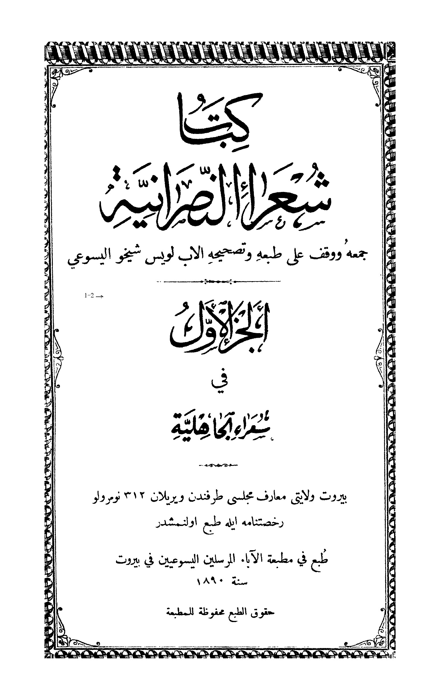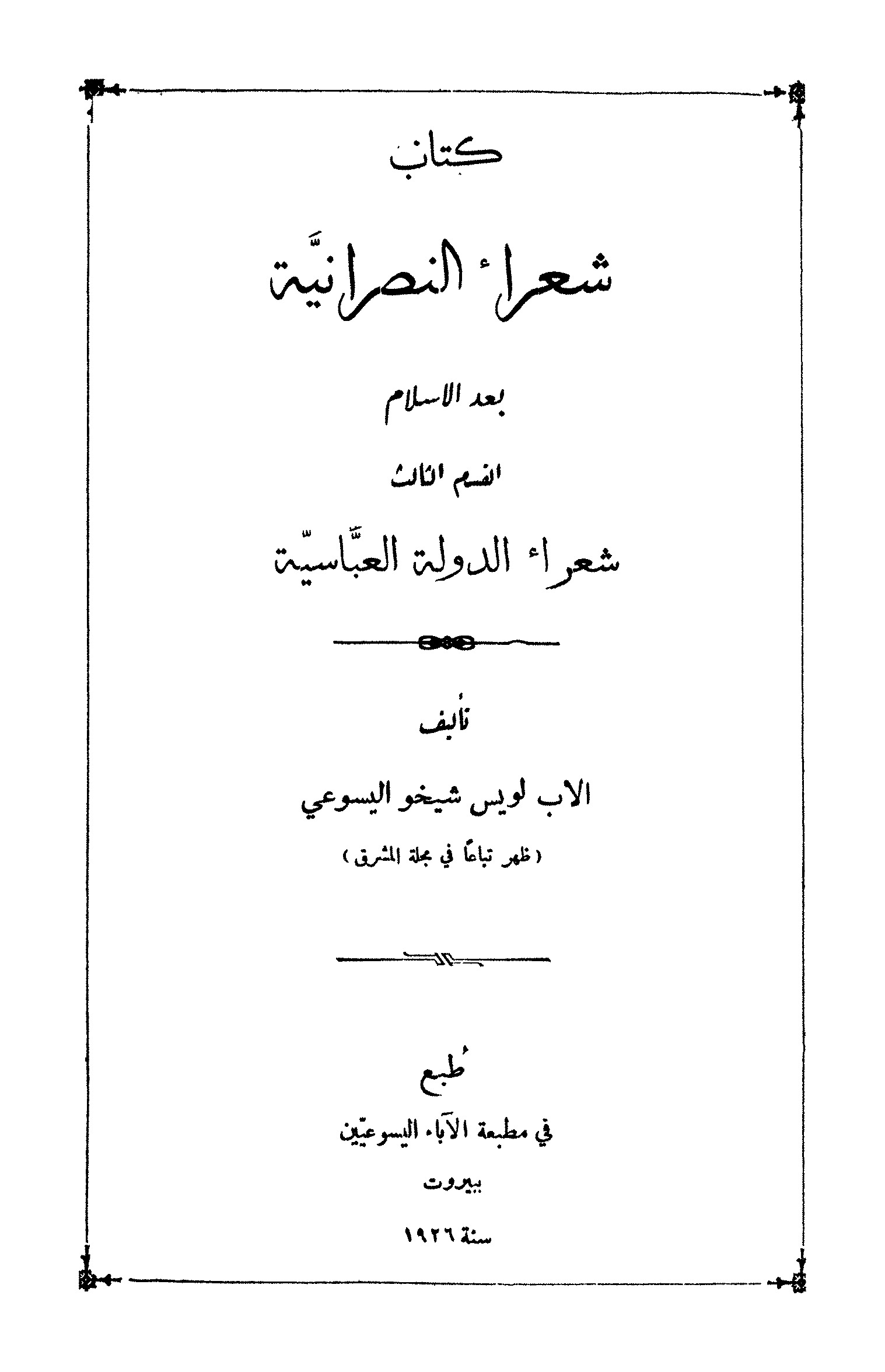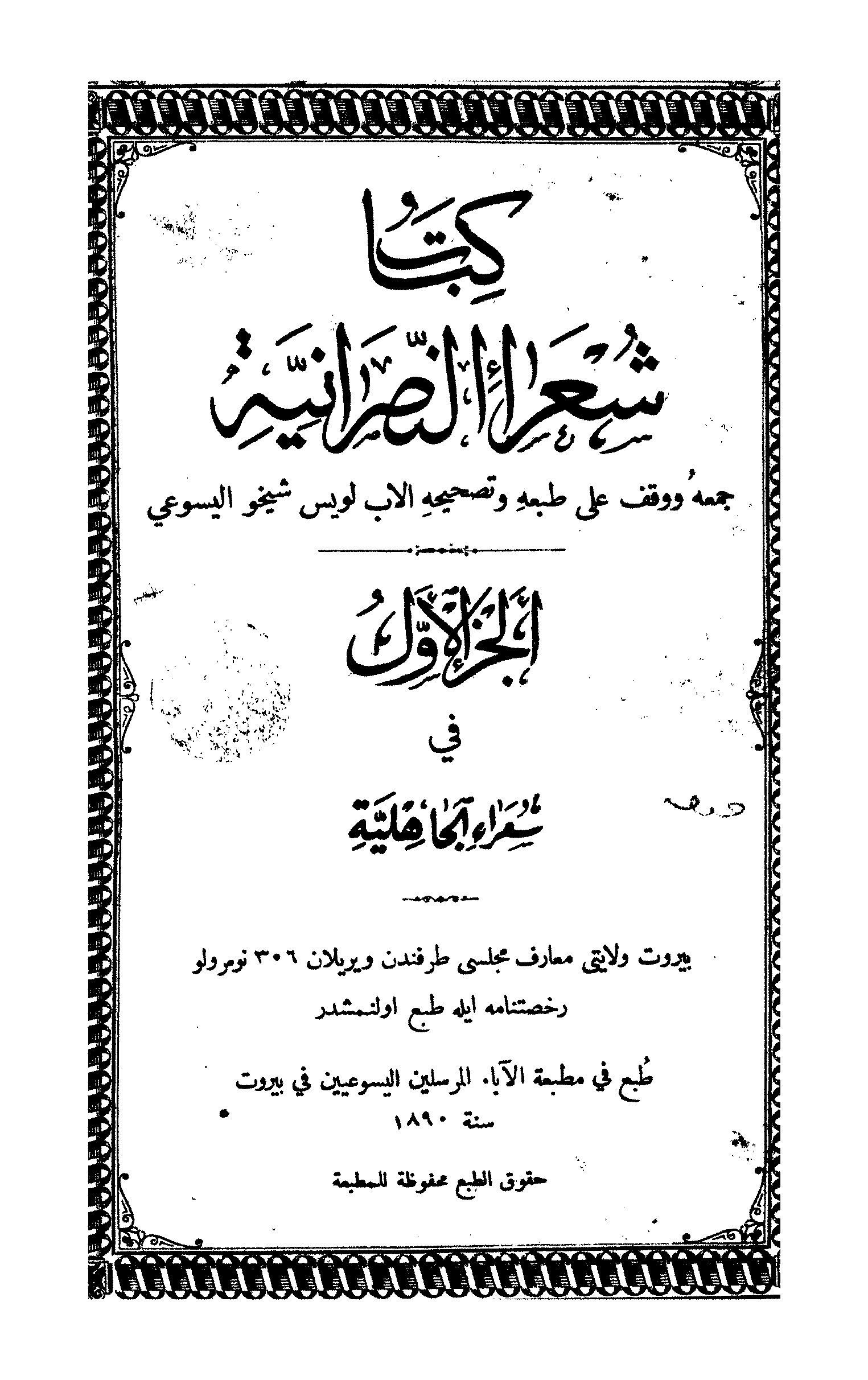 (١) عاش الأب لويس شيخو حياته كلها (۱۸۵۹) - ۱۹۲۷ ) يسعى لتحقيق حلم فريد عظيم ، هو ابراز دور المسيحيين العرب في الحضارة العربية. وقد جند لذلك الهدف علمه الموسوعي وذكاءه الثاقب وهمة قعساء لا ينال منها وهن ولا زمن ، فبين ما للنصارى من مساهمة في الشعر العربي، وتدوين التاريخ بلغة العرب ، واثر في الآداب العربية عامة والفكر الديني والفلسفي خاصة ، فضلاً عما خلفوه من مخطوطات تزخر بها خزائن الكتب العربية .