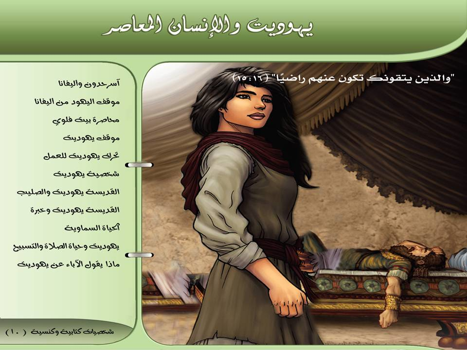 من هي يهوديت ؟ زوجة منسى من أشراف بيت فلوي ، بارعة الجمال ، ترملت لمدة ثلاث سنوات ، وكانت تقيم في غرفة في أعلى بيتها مع جواريها . عاشت في حياة نسكية ، تصوم كل أيام حياتها حتى المساء ، فيما عدا أيام الأعياد . وكانت حريصة على حفظ الناموس . سلمت إدارة كل ممتلكاتها في يد وصيفة لها حتى لا ترتبك بالأمور الزمنية . اتسمت يهوديت بروح القوة والاتكال على الله ، وفي شجاعة تعيش بروح التحدي : ( 1 ) . تحدت الطبيعة كسيدة تود أن تكون أما لها نسل ، وكان المجتمع اليهودي ينظر إلى عدم الإنجاب كعار . إذ لم تنجب لم تطلب أن يتزوجها الولي ليقيم نسلا للميت . لم يكن هذا عن جفاف في المشاعر ، فقد حملت أمومة حانية وباذلة لكل الشعب . ب . تحدت محبة الغنى الزمني ، فسلّمت تدبير كل أمورها المادية لإحدى وصيفاتها . تحدت طبيعتها كامرأة ، فقامت بدور لم يستطع قادة الشعب أن يقوموا به . تحدت أليفانا قائد جيش أشور وقتلته ، هذا الذي كان يرمز لضد المسيح لمقاومته لله الحي ، حاسبا أسرحدون الملك إلها وحيدا . ارتعبت كل الأمم أمامه .